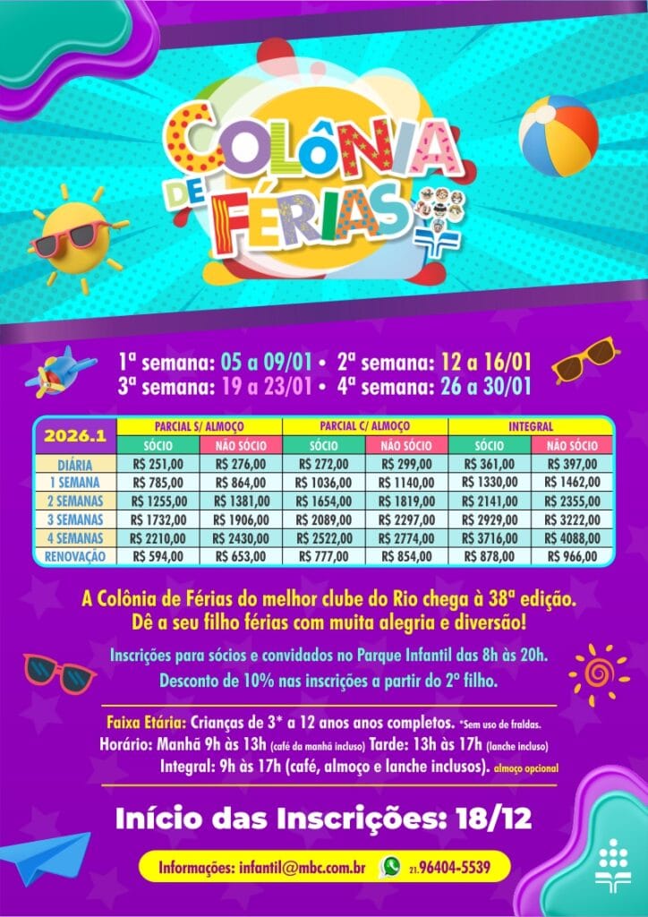 Colônia de Férias Colônia de Férias 56 56 people viewed this event. Registrar-se no evento Para se registrar neste evento, envie um e-mail com seus detalhes para tech@agsomma.com.br Registre-se utilizando um e-mail: Gmail / AOL / Yahoo / Outlook Data e Hora 05/12/2025 à 30/01/2026 Local Marina Barra Clube Categoria do evento Colônia de Férias Compartilhe com Amigos Facebook Twitter LinkedIn Xing Pinterest