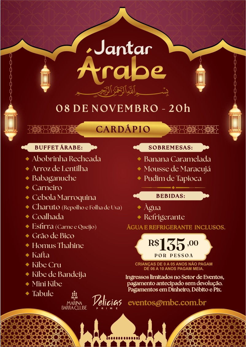 Jantar ÁrabeJantar Árabe 29 29 people viewed this event. Registrar-se no evento Para se registrar neste evento, envie um e-mail com seus detalhes para tech@agsomma.com.br Registre-se utilizando um e-mail: Gmail / AOL / Yahoo / Outlook Data e Hora 08/11/2025 às 20:00 Local Salão Social Categoria do eventoJantarCompartilhe com Amigos Facebook Twitter LinkedIn Xing Pinterest